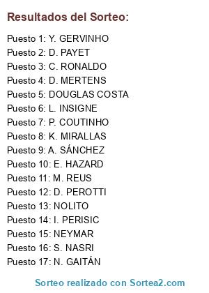 Lista de participantes: C. RONALDO, NEYMAR, A. SÁNCHEZ, E. HAZARD, M. REUS, Y. GERVINHO, DOUGLAS COSTA, D. PAYET, N. GAITÁN, D. MERTENS, NOLITO, K. MIRALLAS, D. PEROTTI, P. COUTINHO, L. INSIGNE, S. NASRI, I. PERISIC.