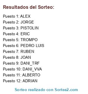 Lista de participantes: ALEX, JORGE, ALBERTO, RUBEN, PEDRO LUIS, ADRIAN, DANI_TRF, TROMPO, PISTOLIN, DANI_VVA, ERIC, JOAN.