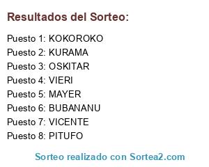 Lista de participantes: BUBANANU, KURAMA, MAYER, VIERI, VICENTE, OSKITAR, PITUFO, KOKOROKO.