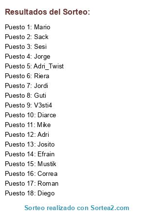 Lista de participantes: Adri, Roman, Guti, Jordi, Mario, Sack, Jorge, Mustik, Riera, Diego, V3sti4, Adri_Twist, Correa, Diarce, Efrain, Sesi, Mike, Josito.