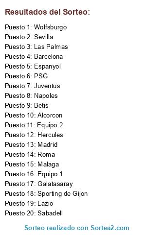 Lista de participantes: Alcorcon, Roma, Sabadell, Barcelona, Galatasaray, Hercules, Juventus, Malaga, Lazio, Betis, Espanyol, Madrid, Sevilla, Napoles, Sporting de Gijon, PSG, Wolfsburgo, Las Palmas, Equipo 1, Equipo 2.