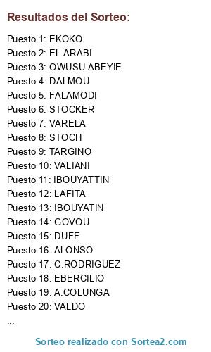 Lista de participantes: STOCH, VARELA, IBOUYATIN, STOCKER, ALAN, TARGINO, DUFF, C.RODRIGUEZ, EKOKO, JEFFREN, GOVOU, FALAMODI, VALIANI, DALMOU, JONAS JUTIERREZ, LAFITA, ALONSO, EBERCILIO, VALDO, IBOUYATTIN, N.CHADLI, EL.ARABI, OWUSU ABEYIE, A.COLUNGA.