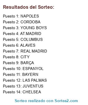 Lista de participantes: AT.MADRID, BAYERN, YOUNG BOYS, CHELSEA, COLUMBUS, CORDOBA, ALAVES, BARÇA, JUVENTUS, CITY, NAPOLES, ESPANYOL, REAL MADRID, LAS PALMAS.