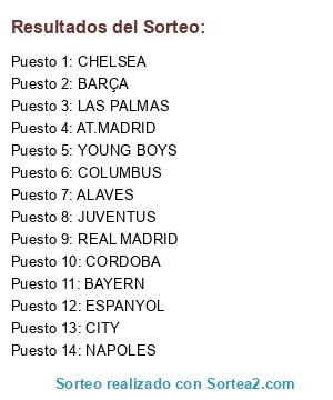 Lista de participantes: AT.MADRID, BAYERN, YOUNG BOYS, CHELSEA, COLUMBUS, CORDOBA, ALAVES, BARÇA, JUVENTUS, CITY, NAPOLES, ESPANYOL, REAL MADRID, LAS PALMAS.