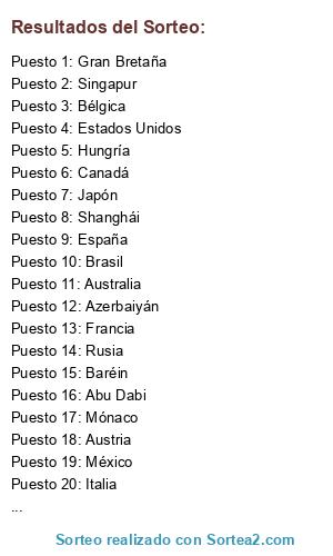 Lista de participantes: Australia, Baréin, Hanói, Shanghái, Zandvoort, España, Mónaco, Azerbaiyán, Canadá, Francia, Austria, Gran Bretaña, Hungría, Bélgica, Italia, Singapur, Rusia, Japón, Estados Unidos, México, Brasil, Abu Dabi.