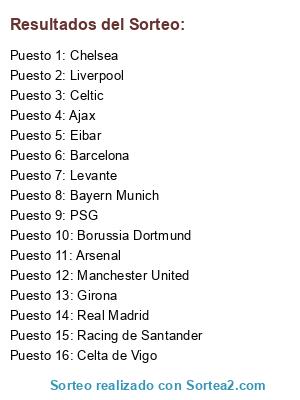 Lista de participantes: Eibar(5), Racing de Santander(7), Celta de Vigo(8), Real Madrid(12), Arsenal(15), Girona(18), Manchester United(24), PSG(30), Liverpool(40), Borussia Dortmund(50), Bayern Munich(61), Ajax(80), Levante(110), Barcelona(140), Celtic(180), Chelsea(220).