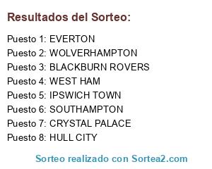Lista de participantes: ARSENAL, CHELSEA, MANCHESTER CITY, EVERTON, MANCHESTER UNITED, LIVERPOOL, TOTTENHAM, SOUTHAMPTON, SUNDERLAND, LEICESTER, NEW CASTLE, ASTON VILLA, WEST HAM, QPR, FULHAM, MIDDLESBROUGH, BLACKBURN ROVERS, WOLVERHAMPTON, BLACKPOOL, WATFORD, STOKE CITY, WIGAN, CRYSTAL PALACE, WEST BROMWICH, DERBY COUNTY, NOTTINGHAM FOREST, IPSWICH TOWN, LEEDS, HULL CITY, SWANSEA, BURNLEY, CARDIFF.