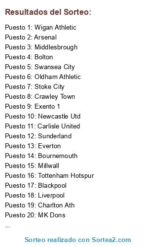 Lista de participantes: Arsenal, Aston Villa, Chelsea, Everton, Fulham, Liverpool, Manchester City, Manchester United, Newcastle Utd, Norwich City, Queens Park Rangers, Reading, Southampton, Stoke City, Sunderland, Swansea City, Tottenham Hotspur, West Bromwich Albion, West Ham United, Wigan Athletic, Barnsley, Birmigham City, Blackburn, Blackpool, Bolton, Brighton, Bristol City, Burnley, Cardiff City, Charlton Ath, Crystal Palace, Derby, Huddersfield, Hull City, Ipswich town, Leeds United, Leicester City, Middlesbrough, Millwall, Nott'm Forest, Peterborough, Sheffield Wed., Watford, Wolverhampton, Bournemouth, Brentford, Bury, Carlisle United, Colchester, Coventry City, Crawley Town, Crewe Alexandra, Doncaster, Hartlepool, Leyton Orient, MK Dons, Notts County, Oldham Athletic, Exento 1, Exento 2, Exento 3, Exento 4, Exento 5, Exento 6.