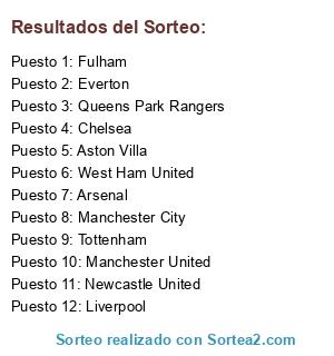 Lista de participantes: Everton, Tottenham, Liverpool, Aston Villa, Arsenal, Manchester City, Queens Park Rangers, Newcastle United, Chelsea, Manchester United, West Ham United, Fulham.