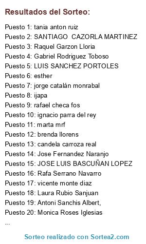 Lista de participantes: Antoni Sanchis Albert,, brenda llorens, candela carroza real, elisenda ortiz belenguer, Fernanda Martínez, Gabriel Rodriguez Toboso, ignacio parra del rey, ijapa, JOAQUIN LEON PEREZ, jorge catalán monrabal, jorge gr, Jose Fernandez Naranjo, JOSE LUIS BASCUÑAN LOPEZ, Josep Puig, Laura Rubio Sanjuan, Lina Mateo Ponce, LUIS SANCHEZ PORTOLES, MªAMPARO CAZORLA VIANA, marta mrf, Monica Roses Iglesias, Rafa Serrano Navarro, rafael checa fos, RAFAEL, Raquel Garzon Lloria, Rubén Escudero Plaza, SANTIAGO CAZORLA MARTINEZ, tania anton ruiz, vicente monte diaz, esther.