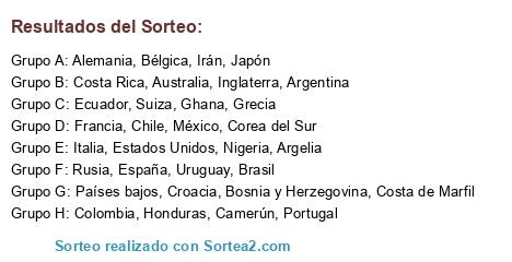 Lista de participantes: Brasil, Australia, Irán, Japón, Corea del Sur, Ghana, Nigeria, Camerún, Costa de Marfil, Argelia, Estados Unidos, Costa Rica, Honduras, México, Argentina, Colombia, Chile, Ecuador, Uruguay, Alemania, Países bajos, Bélgica, Francia, Suiza, Grecia, Portugal, Croacia, Bosnia y Herzegovina, Italia, España, Rusia, Inglaterra.