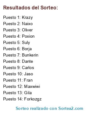 Lista de participantes: Forkozgz, Oliver, Maxwiwi, Naixo, Bunkerin, Carlos, Suly, Jaso, Fran, Krazy, Gila, Poxion, Borja, Dante.