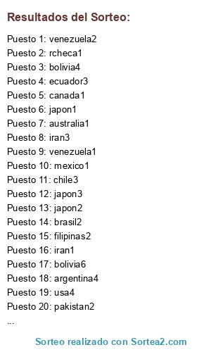 Lista de participantes: ecuador1, ecuador2, ecuador3, ecuador4, mexico1, mexico2, mexico3, peru1, peru2, venezuela1, venezuela2, colombia1, chile1, chile2, chile3, chile4, chile5, pakistan1, pakistan2, paraguay1, paraguay2, filipinas1, filipinas2, filipinas3, filipinas4, iran1, iran2, iran3, canada1, canada2, bolivia1, bolivia2, bolivia3, bolivia4, bolivia5, bolivia6, india1, india2, rcheca1, rcheca2, rcheca3, rcheca4, siria1, siria2, brasil1, brasil2, brasil3, china1, china2, china3, argentina1, argentina2, argentina3, argentina4, usa1, usa2, usa3, usa4, japon1, japon2, japon3, japon4, honduras1, honduras2, honduras3, cuba1, uruguay1, uruguay2, australia1, australia2.
