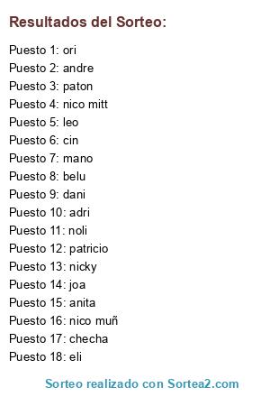 Lista de participantes: nicky, cin, paton, noli, belu, adri, leo, nico mitt, nico muñ, eli, ori, checha, mano, andre, dani, joa, patricio, anita.