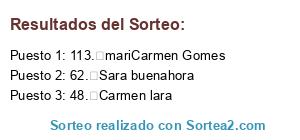 Lista de participantes: 1. maribel gordillo maribelgr, 2. Julián julian, 3. Elvira elvirabm1981, 4. Andrea andrea25m, 5. Olala Costas olaia_costas, 6. Roser scaroleblonde, 7. Susana sulocas, 8. Elsa elsiwi, 9. Aranzazu zazulilla, 10. Rocío losmundosdemariroci, 11. Pichi, 12. Inma inmapenades, 13. Raquel Shepseskare, 14. Toñi Costa Blanco ancobl, 15. Míriam myrikadelorca, 16. Sonia mimolicreaciones, 17. Croquette du Almendreque, 18. Bea embrujada22, 19. MAyte aria19.mrg, 20. Pili taranis_, 21. Sonia sonnycricre, 22. Burmapinta/Marta C Dehesa, 23. Miryoku, 24. Marisa marcasell, 25. Ferra Toledo ferran2, 26. Aida la Möna, 27. MJ mjose_climent, 28. Yolanda yolapa28, 29. Veronica veronica.real.perez, 30. Raquel nala_dina, 31. Rocio oicorindia, 32. Noemi alamovalenzuela, 33. Marcela di_rivera2005, 34. Mariló Gálvez marilogf73, 35. Celia celiarosellosalvador, 36. Tikismikis – Malder, 37. Silvia Aivisluar87, 38. Mar mayo Roo, 39. Patricia lopezgonzalez, 40. Laura laurdisseny2, 41. Misi mmayto, 42. Lanunnu, 43. Antía, 44. Mariam de la tetera verde, 45. Ana machado, 46. Angeles casas, 47. Silvi*, 48. Carmen lara, 49. Inmaculada inmasoloparatuenti, 50. Encarna encarnapenades, 51. Grete gretelain, 52. Jose Antonio esteve juan, 53. Elena gobernado7, 54. Zahida, 55. Alba alba.garcia.garrido1, 56. Virginia pinilla, 57. Gemma gmgansa, 58. Magda Alfaro, 59. Silvia s.fuertes, 60. Sú rodríguez, 61. Bego begosanchezsoria, 62. Sara buenahora, 63. Dunia, 64. Petite blasa, 65. Asun yayi1974, 66. Veronica vespivana, 67. Veronica verina2001, 68. Vero verige80, 69. Patricia patriabalo, 70. Lorena macas, 71. Maria jose bernal, 72. Leyre soytodatuley, 73. Irene morilla, 74. Cecilia cecilialitorro, 75. Fatima Redondo, 76. Maria jose hernandez solrea, 77. Karina karinaprevende, 78. Isabel isabelmrael, 79. Yaiza calasanz, 80. Yurancha, 81. Vero veromakeup8, 82. Marreyes, 83. Nuria cuikiki, 84. Adela adela73, 85. Celia gomez tomas, 86. La boutique de las hadas, 87. Mriam miropa8, 88. Pakito pakitokarri, 89. Sonia soniayanguas, 90. Marga margami, 91. Pilar pilarsolermozal, 92. Ana elbauldeloscolores, 93. Gloria glorispelu, 94. Vanesa vannelunna, 95. Sara videogirl, 96. Miriam mircasa, 97. Noemi miss.geishy, 98. Sunny sajof, 99. Ainhoa areverte, 100. Loli panzuela silva, 101. Inma inmasenet73, 102. Rosalia alcrique, 103. Rosa maria saavedra Martinez, 104. Maria inmapenades, 105. Mbsweetcakes MCarmen, 106. Maria aparicio, 107. Alana rabal corral, 108. Lola lolescarbonellgimenez, 109. Moria Ortega Navarro, 110. Cristina cristina197722, 111. Fieltro felt feltro, 112. Carmen Carmen.dm, 113. mariCarmen Gomes, 114. sole sole_losada, 115. hester, 116. laura llongo, 117. cristina cristinariudetot, 118. mamen Madrid, 119. phillip Eckert, 120. nanda, 121. laura crespillo, 122. Vanessa castillejovanessa, 123. Mayte stalkym, 124. Ingrid Ingrid_castillejo, 125. Matilin Garcia, 126. Jessica len, 127. Monica perez cea, 128. Miguel abhorash, 129. Rouss, 130. Marta mem26, 131. Charo charocascales, 132. Maria Montero, 133. Ana haniuxka, 134. Mariaje, 135. Carmen C civereta2, 136. Esti, 137. Rocio parrilla pequemodels, 138. Carolina cmtalavera, 139. Maria rodriguez baz, 140. Olga onic71, 141. Maria marigdi.