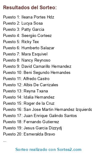 Lista de participantes: Blanca Rodriguez Roque, Ricky Tex, Jesus Muchacho Alegre, NeLly RamOs, Edson Ortega Sanchez, Juan Enrique Galindo Santos , Jose Refugio Perez, Ana Lopez, Sarahy Lovee, Roger de la Cruz, Roxana Delgado, Alison DE Garza, Chivis Rangel, Eduardo Fuentes, Axeneth Trompuditha Hermozha, May Garcia, Reyna Txana, Marisol Hdz Almaguer, Lobo Tejano, Francisco Castro, Violeta Hernandez Estrada, Elsa Orozco, Pryncesa Txana , Shumis Torres, Dennise Garcia, Yazmin Esmeralda , Chule Alanis, Ara Gzz, Lucya Sosa, Carlos Pachuco, Albis De Carrizales, David Camarillo Hernandez, Tiitha Mendooza, Nany Mateo Ramirez , Esmeralda Bravo, Teresita Rodriguez Guajardo, Sandris Ortiz Estrada Vtr Strada, Jony Chocorrol Hdz, Mony Mtz , Fatima Delgado, Mamita Katty Dayana, Tomas Cruz Arellano Briones , Seergiio Corteez, JuanFco Coronado, Olga Lydia Gonzalez Martinez, Angelica Gloria Alonso, Martha Aracely Quiroz Torres , Esperanza Hernandez Eufracio , Mara Esquivel , Alejandra Leyva, Patty Garcia, Isidro Ramirez, Jesse Priapo Martínez Rdz, Aurora CS, Aracely Rendon Ramos , Ileana Portes Hdz, Ana Isabel Rodriguez Orozco, Gaytan David , Nelson Rangel Gzz , Angy Garcia, Mikeyla Ambriz , Humberto Salazar , Luisa Garcia , Victor Hugo Rodriguez Corte, Lucio Castillo , July Villegas , Ismael Reyes Vazquez, Paty Jaramillo, Jesus Garcia Dizzydj , Carlitos Trujillo, Alfredo Castro, Fernando Gutierrez, Ana Serna, Idalia Hernandez, Beni Segundo Hernandes, Juan Lobo Mtz, Gabriel Arellano Vilchis, Mario A Rmz C , San Jose Martin Hernandez Izquierdo, Rrotciv Pereyyra , Charl Dmz, Kastrejon Lezly , Nancy Reynoso , Jas Vela, Daniel Martinez Andrade, Nora Azpilcueta, Oscar Fdo Garcia Gza, Sandy Eliza, Coco Rivas.