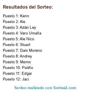 Lista de participantes: Stuart, Ale, Dani Moreno, Jaci, Ale Nico, Adán Ley, Andrey, Patiño, Memo, Kenn, Edgar, Varo Umaña.