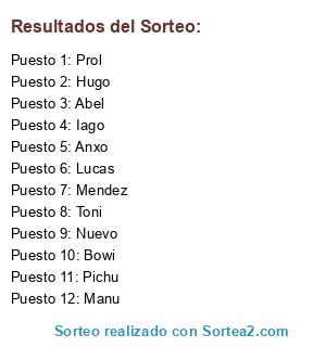 Lista de participantes: Abel, Anxo, Bowi, Hugo, Iago, Lucas, Manu, Mendez, Nuevo, Pichu, Prol, Toni.