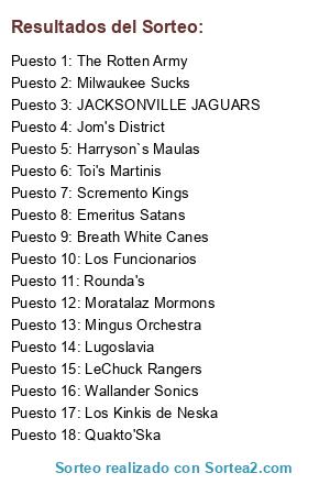 Lista de participantes: Breath White Canes, Emeritus Satans, Harryson`s Maulas, JACKSONVILLE JAGUARS, Jom's District, LeChuck Rangers, Los Funcionarios, Los Kinkis de Neska, Lugoslavia, Milwaukee Sucks, Mingus Orchestra, Moratalaz Mormons, Quakto'Ska, Rounda's, Scremento Kings, The Rotten Army, Toi's Martinis, Wallander Sonics.