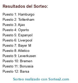 Lista de participantes: Oporto, Liverpool, Ajax, Espanyol, Atletico, Bayer M, Bremen, Barsa, Hamburgo, Tottenham, Leverkusen, Borussia.