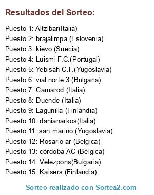 Lista de participantes: Kaisers (Finlandia), danianarkos(Italia), Rosario ar (Belgica), Altzibar(Italia), san marino (Yugoslavia), Lagunilla (Finlandia), Camarod (Italia), Yebisah C.F.(Yugoslavia), Luismi F.C.(Portugal), Velezpons(Bulgaria), Duende (Italia), vial norte 3 (Bulgaria), kievo (Suecia), córdoba AC (Bélgica), brajalimpa (Eslovenia).