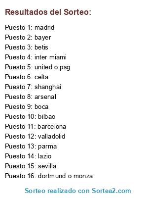 Lista de participantes: shanghai, barcelona, sevilla, lazio, celta, madrid, bilbao, inter miami, parma, boca, united o psg, bayer, betis, arsenal, dortmund o monza, valladolid.