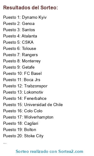 Lista de participantes: PSV Eindhoven, Rubin, Stoke City, West Bromwich Albion, Trabzonspor, Fenerbahce, Cagliari, Universidad de Chile, Genoa, Boca Jrs, Estudiantes LP, Tolouse, Hoffenheim, Monterrey, Bolton, Lokomotiv, Getafe, Montpellier, CSKA, Dynamo Kyiv, FC Basel, Wolverhampton, Real Sociedad, Colo Colo, Shakhtar Donetsk, Blackburn Rovers, Santos, Atalanta, Flamengo, Racing Club, Rangers, Velez.