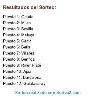 Lista de participantes: Ajax, Benfica, Villareal, Getafe, Celtic, Betis, Milan, Barcelona, Sevilla, River Plate, Galatasaray, Malaga.