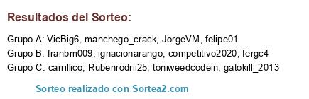 Lista de participantes: gatokill_2013, franbm009, VicBig6, carrillico, ignacionarango, felipe01, manchego_crack, JorgeVM, Rubenrodrii25, fergc4, toniweedcodein, competitivo2020, se_cano.
