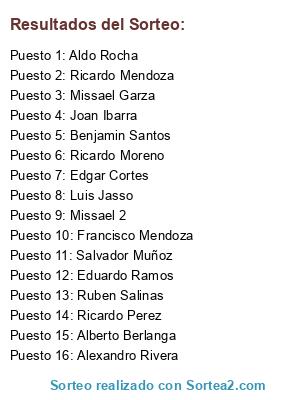 Lista de participantes: Eduardo Ramos, Aldo Rocha, Edgar Cortes, Ricardo Perez, Ricardo Mendoza, Missael Garza, Ruben Salinas, Alberto Berlanga, Salvador Muñoz, Ricardo Moreno, Luis Jasso, Alexandro Rivera, Joan Ibarra, Benjamin Santos, Missael 2, Francisco Mendoza.