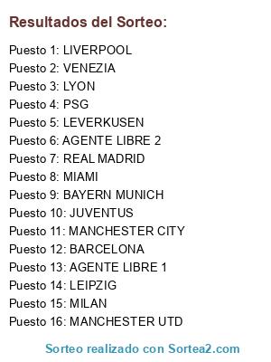 Lista de participantes: BARCELONA, BAYERN MUNICH, LYON, LEIPZIG, PSG, VENEZIA, JUVENTUS, MANCHESTER UTD, MIAMI, LEVERKUSEN, LIVERPOOL, MILAN, MANCHESTER CITY, REAL MADRID, AGENTE LIBRE 1, AGENTE LIBRE 2.