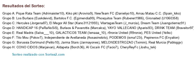 Lista de participantes: PODEMOS (isma123i), CheryReyFc (Joshu_tek), MELONDESTROZAO (Tximini), r9ronie United (R9ronie), VilartagasTeam (J_murcia), Independiente de Avellaneda (Assasinstoto), Dream Team (Juangutierrez91), Jarma Stars (Jarmayones), Gironaited (U1060358), Real Madris (Salva___10), Kiko pkt (Arovira9), GALACTICOS TEAM (Ismaaa_10), Pique Rata Team (Adrimaister10), Tito Mou (Pokov7), Al Cocaín FC (Facio7), DRINK TEAM (Braveitor97), NewTeam FC (Danieliyo10), PES United (Yelko), Real Murcia (Pabloggv), Hercules (Jorgena87), YAYO VALLECANO (Aparisi93), Borussia Dortmund (Pelito10), Pepineros FC (Enyalion), HANDICAP 16 (PaRaNoSiS), Arnau Matau C.C. (Spain_kiko), Phosquitos Team (Rubenet1986), El Megor All Star (Kano31121993), Aldapeta (Borch36), Los Burlaos (Euskdeivid), Burlaos & Pavarottis (Marcalca), Bartolos F.C. (Egimendia99), CONO CIDOS (Marjaivan).