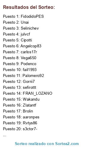 Lista de participantes: aaronpes, Angelcop83, Brolin, carlos17r, Cipotti, Fabio_85, fail1993, fcozelaya, FidodidoPES, FRAN_LOZANO, Gorrii7, julvcf, Palomero92, Podenco, richisanfer, Rvtys86, s3ctor7-, sefirottt, Selinichev, Unai, Vega650, vicent_garcia, Wakandu, Zlatantf.