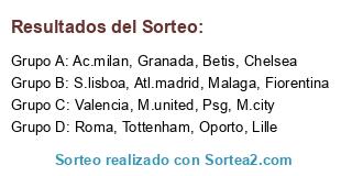 Lista de participantes: Tottenham, S.lisboa, Psg, Roma, Lille, M.city, Atl.madrid, Ac.milan, Malaga, Granada, Betis, Oporto, Valencia, Chelsea, Fiorentina, M.united.