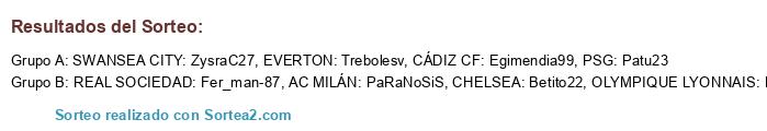 Lista de participantes: SWANSEA CITY: ZysraC27, CÁDIZ CF: Egimendia99, EVERTON: Trebolesv, AC MILÁN: PaRaNoSiS, PSG: Patu23, CHELSEA: Betito22, REAL SOCIEDAD: Fer_man-87, OLYMPIQUE LYONNAIS: Paneke10.