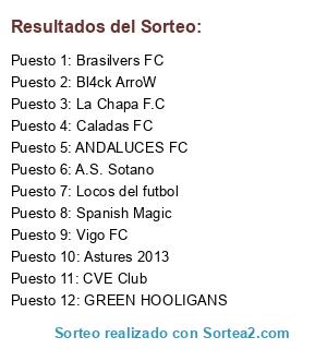 Lista de participantes: GREEN HOOLIGANS, Spanish Magic, La Chapa F.C, ANDALUCES FC, Vigo FC, Caladas FC, CVE Club, Bl4ck ArroW, Locos del futbol, A.S. Sotano, Brasilvers FC, Astures 2013.
