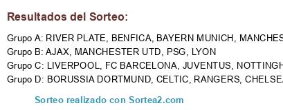 Lista de participantes: FC BARCELONA, CHELSEA, JUVENTUS, BENFICA, RIVER PLATE, BAYERN MUNICH, MANCHESTER UTD, LIVERPOOL, LYON, MANCHESTER CITY, AJAX, BORUSSIA DORTMUND, RANGERS, PSG, NOTTINGHAM FOREST, CELTIC.