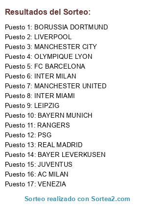 Lista de participantes: AC MILAN, BAYER LEVERKUSEN, BAYERN MUNICH, BORUSSIA DORTMUND, FC BARCELONA, INTER MIAMI, INTER MILAN, JUVENTUS, LIVERPOOL, MANCHESTER CITY, MANCHESTER UNITED, OLYMPIQUE LYON, PSG, RANGERS, LEIPZIG, REAL MADRID, VENEZIA.