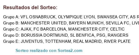 Lista de participantes: FC BARCELONA, MANCHESTER CITY, REAL MADRID, PSG, OLYMPIQUE LYON, JUVENTUS, BORUSSIA DORTMUND, AJAX, VFL OSNABRUCK, MANCHESTER UNITED, RANGERS, BAYERN MUNICH, LIVERPOOL FC, AS ROMA, TOTTENHAM, SL BENFICA, RIVER PLATE, SWANSEA CITY, SEVILLA FC, CELTIC.