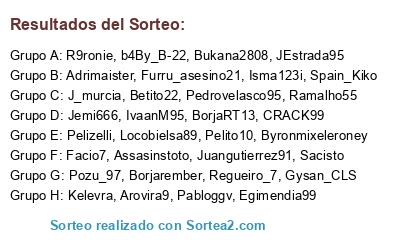 Lista de participantes: Juangutierrez91, Isma123i, CRACK99, Sacisto, Assasinstoto, Pabloggv, IvaanM95, Facio7, Ramalho55, J_murcia, JEstrada95, Kelevra, Gysan_CLS, Pelito10, R9ronie, Furru_asesino21, Arovira9, Pedrovelasco95, Locobielsa89, b4By_B-22, Byronmixeleroney, Betito22, Pelizelli, Egimendia99, Borjarember, Bukana2808, BorjaRT13, Regueiro_7, Spain_Kiko, Adrimaister, Pozu_97, Jemi666.