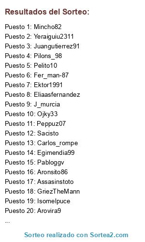 Lista de participantes: Assasinstoto, Isma123i, BorjaRT13, Pabloggv, Pelito10, Egimendia99, Yeraiguiu2311, Ramalho55, Juangutierrez91, Facio7, Zysr4C29, Pelizelli, J_murcia, Mincho82, Furru_asesino21, Gysan_CLS, Borjarember, Arovira9, Pedrovelasco95, Ektor1991, Sersol13, Carlos_rompe, GriezTheMann, Yj1613, Joaquin_embiLMCF, IvaanM95, SeKa33, Byronmixeleroney, Juanpy92, Eliaasfernandez, Stewiedm27, Locobielsa89, Aronsito86, Sacisto, Peppuz07, Isomelpuce, Ojky33, Pilons_98, FromColombia1969, Fer_man-87.