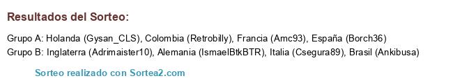 Lista de participantes: España (Borch36), Brasil (Ankibusa), Italia (Csegura89), Colombia (Retrobilly), Francia (Amc93), Inglaterra (Adrimaister10), Holanda (Gysan_CLS), Alemania (IsmaelBtkBTR).