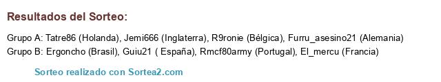 Lista de participantes: El_mercu (Francia), Guiu21 ( España), Furru_asesino21 (Alemania), Ergoncho (Brasil), Rmcf80army (Portugal), Tatre86 (Holanda), Jemi666 (Inglaterra), R9ronie (Bélgica).