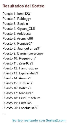 Lista de participantes: Marjaivan, Isma123i, Byronmixeleroney, Tanito226, Regueiro_7, Famorvizoso, Eliaasfernandez, Pabloggv, Ankibusa, Pedrovelasco95, R9ronie, Zysr4C29, Furru_asesino21, Spain_Kiko, J_murcia, Stiwiedm27, Pelito10, Juangutierrez91, Gysan_CLS, Yeraiguiu2311, Enyalion, Pelizelli, IvaanM95, Arovira9, Facio7, Egimendia99, BorjaRT13, Betito22, Ramalho55, Locobielsa89, Jemi666, Peppuz07, Sacisto, Borjarember, Errol_mitchum, RonMatusalem13, Aronsito86, esparta087, Fer_man-87, Santo004.