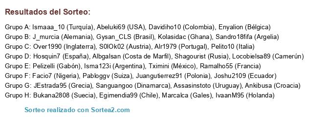 Lista de participantes: Pabloggv (Suiza), IvaanM95 (Holanda), Sandro18fifa (Argelia), Kolasidac (Ghana), Locobielsa89 (Camerún), Pelizelli (Gabón), Ismaaa_10 (Turquía), Pelito10 (Italia), Over1990 (Inglaterra), Joshu2109 (Ecuador), Enyalion (Bélgica), Davidiho10 (Colombia), Facio7 (Nigeria), Shagourist (Rusia), Alr1979 (Portugal), S0lOk02 (Austria), Gysan_CLS (Brasil), Abeluki69 (USA), Egimendia99 (Chile), Bukana2808 (Suecia), Marcalca (Gales), Assasinstoto (Uruguay), Tximini (México), Sanguangoo (Dinamarca), Isma123i (Argentina), Ankibusa (Croacia), Ramalho55 (Francia), J_murcia (Alemania), Hosquin7 (España), Albgalsan (Costa de Marfil), Juangutierrez91 (Polonia), JEstrada95 (Grecia).