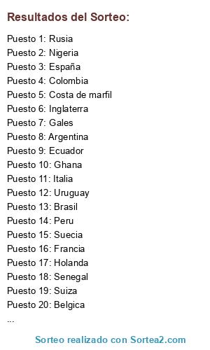 Lista de participantes: Belgica, Croacia, Inglaterra, Francia, Alemania, Italia, Holanda, Portugal, Rusia, Serbia, España, Suecia, Suiza, Gales, Senegal, Camerun, Costa de marfil, Nigeria, Mexico, Colombia, Chile, Brasil, Argentina, Uruguay, Ecuador, Peru, Japon, Ghana.