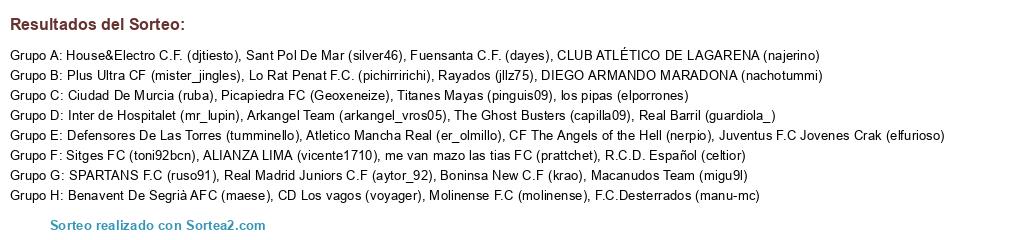 Lista de participantes: Lo Rat Penat F.C. (pichirririchi), Plus Ultra CF (mister_jingles), Macanudos Team (migu9l), CLUB ATLÉTICO DE LAGARENA (najerino), The Ghost Busters (capilla09), R.C.D. Español (celtior), Fuensanta C.F. (dayes), Juventus F.C Jovenes Crak (elfurioso), Sant Pol De Mar (silver46), Sitges FC (toni92bcn), Rayados (jllz75), Boninsa New C.F (krao), F.C.Desterrados (manu-mc), me van mazo las tias FC (prattchet), Arkangel Team (arkangel_vros05), CD Los vagos (voyager), Picapiedra FC (Geoxeneize), ALIANZA LIMA (vicente1710), CF The Angels of the Hell (nerpio), Benavent De Segrià AFC (maese), Titanes Mayas (pinguis09), Defensores De Las Torres (tumminello), Ciudad De Murcia (ruba), Real Barril (guardiola_), House&Electro C.F. (djtiesto), Inter de Hospitalet (mr_lupin), DIEGO ARMANDO MARADONA (nachotummi), SPARTANS F.C (ruso91), Molinense F.C (molinense), Atletico Mancha Real (er_olmillo), los pipas (elporrones), Real Madrid Juniors C.F (aytor_92).