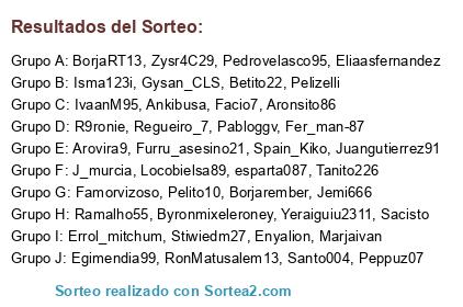 Lista de participantes: Marjaivan, Isma123i, Byronmixeleroney, Tanito226, Regueiro_7, Famorvizoso, Eliaasfernandez, Pabloggv, Ankibusa, Pedrovelasco95, R9ronie, Zysr4C29, Furru_asesino21, Spain_Kiko, J_murcia, Stiwiedm27, Pelito10, Juangutierrez91, Gysan_CLS, Yeraiguiu2311, Enyalion, Pelizelli, IvaanM95, Arovira9, Facio7, Egimendia99, BorjaRT13, Betito22, Ramalho55, Locobielsa89, Jemi666, Peppuz07, Sacisto, Borjarember, Errol_mitchum, RonMatusalem13, Aronsito86, esparta087, Fer_man-87, Santo004.