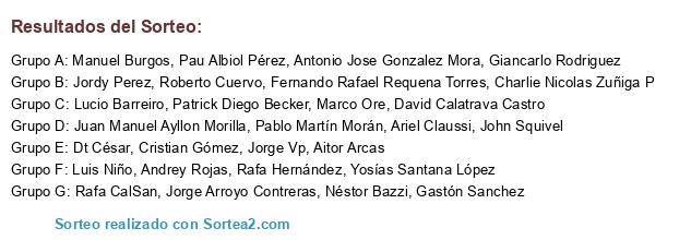 Lista de participantes: Aitor Arcas, Roberto Cuervo, David Calatrava Castro, Ariel Claussi, Andrey Rojas, Jordy Perez, Marco Ore, Pablo Martín Morán, Patrick Diego Becker, Juan Manuel Ayllon Morilla, Lucio Barreiro, Dt César, Pau Albiol Pérez, Gastón Sanchez, Yosías Santana López, Giancarlo Rodriguez, Cristian Gómez, Néstor Bazzi, Charlie Nicolas Zuñiga P, Rafa CalSan, Rafa Hernández, Jorge Arroyo Contreras, John Squivel, Manuel Burgos, Fernando Rafael Requena Torres, Antonio Jose Gonzalez Mora, Luis Niño, Jorge Vp.