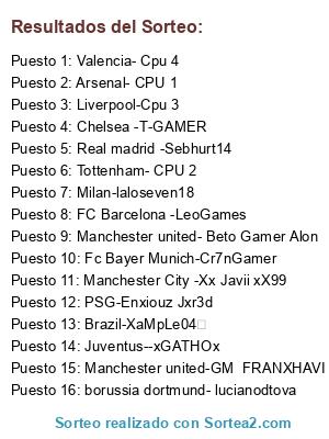 Lista de participantes: Chelsea -T-GAMER, Real madrid -Sebhurt14, Milan-laloseven18, FC Barcelona -LeoGames, PSG-Enxiouz Jxr3d, Manchester City -Xx Javii xX99, Fc Bayer Munich-Cr7nGamer, Juventus--xGATHOx, Manchester united-GM FRANXHAVI, Brazil-XaMpLe04, borussia dortmund- lucianodtova, Arsenal- CPU 1, Manchester united- Beto Gamer Alon, Liverpool-Cpu 3, Valencia- Cpu 4, Tottenham- CPU 2.